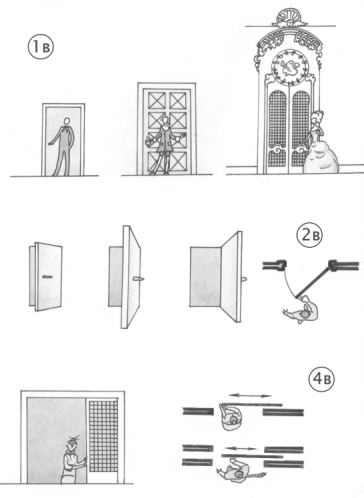 Так, например, в японской культуре дверь - это изменяющаяся в размерах щель в плоскости стены. Самоценности двери в японской культуре по настоящему нет, есть расширяющийся или уменьшающийся переход из одного пространства в другое. Такая дверь занимает меньше места, но требует короткой паузы остановки перед ней и передачи нагрузки тела в перпендикулярном направлении от необходимого пути движения. И лучше для этого использовать помощь слуги или механизма (рис4в). Поэтому этот вариант двери не может стать лучшим альтернативным примером.